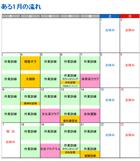 原則、毎週月、火、木曜日は一日作業を行います。水、金曜日は午前作業、午後は様々なプログラムを実施しています。また、各科嘱託医による健康管理、体を動かすプログラム、文化的な活動などを多様に取り入れています。